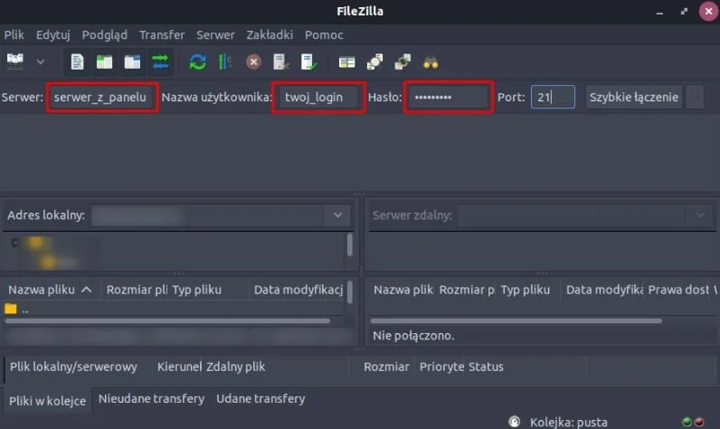 Aby połączyć się do FTP przez program FileZilla, wprowadź dane wg wzoru z obrazka poniżej i wybierz „Szybkie łączenie”. Pamiętaj, aby zaznaczone pola uzupełnić poprawną nazwą serwera, loginem i hasłem, które uzyskałeś, podążając za wcześniejszymi krokami tej instrukcji.