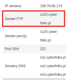 Uwaga! Zdjęcie zawiera przykładową nazwę serwera FTP. Właściwy serwer znajdziesz w panelu administracyjnym Twojego hostingu.